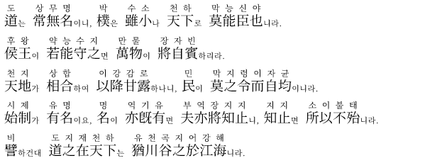 '도'는 영원히 이름이 없으니, '통나무'는 비록 작지만 천하에 능히 그를 '신하로 삼을 자'가 없느니라.