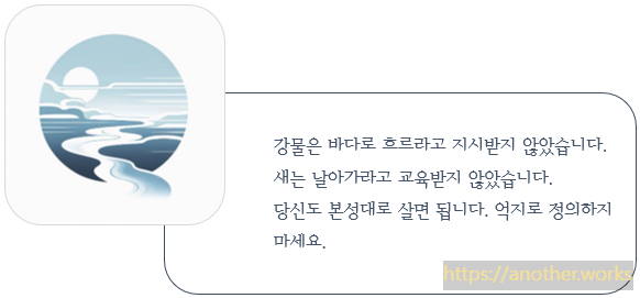 - 자연스러운 흐름: 도는 강과 바다가 모든 시냇물과 골짜기를 자연스럽게 받아들이듯, 인위적인 노력을 하지 않아도 만물을 포용하고 조화롭게 흐르게 합니다.