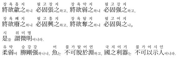 장차 그것을 오므리려 한다면, 반드시 먼저 그것을 펴야 하며, 장차 그것을 약하게 하려 한다면, 반드시 먼저 그것을 강하게 해야 하며,