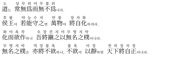 (만물이) 스스로 교화되다가도 만약 욕심이 일어난다면, 나는 그것을 '이름 없는 통나무'의 소박함으로 진정시킬 것이다.