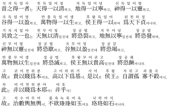 옛날에 하나(도의 근원)를 얻은 것들은, 하늘은 하나를 얻어 맑아지고, 땅은 하나를 얻어 안정되며, '신'은 하나를 얻어 신령해지고,