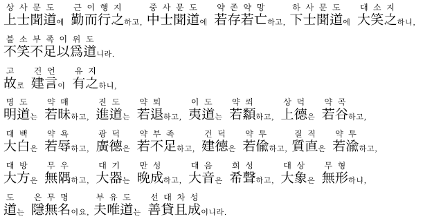 밝은 도는 어두운 듯하고, 나아가는 도는 물러나는 듯하며, 평탄한 도는 험한 듯하다. 가장 높은 덕은 골짜기처럼 낮고, 크게 희고 밝은 것은 욕된 듯하며, 넓은 덕은 부족한 듯하고, 굳건한 덕은 게으른 듯하며, 순수한 본질은 변한 듯하다. '큰 네모'는 모서리가 없고, '큰 그릇'은 늦게 완성되며, '큰 소리'는 소리가 들리지 않고, '큰 형상'은 형상이 없다.