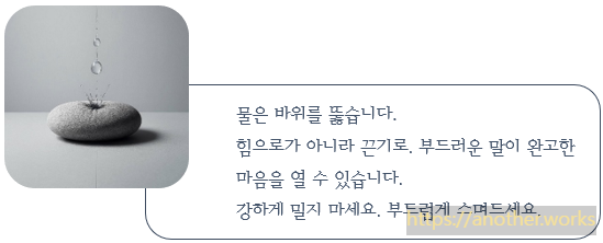 - 지극히 부드러운 것의 승리: 물과 같은 '지극히 부드러운 것(至柔)'은 바위와 같은 '지극히 단단한 것(至堅)'을 관통하고 마모시키며 세상을 움직입니다. 유연함이 경직된 강함을 이긴다는 노자의 핵심 사상입니다.