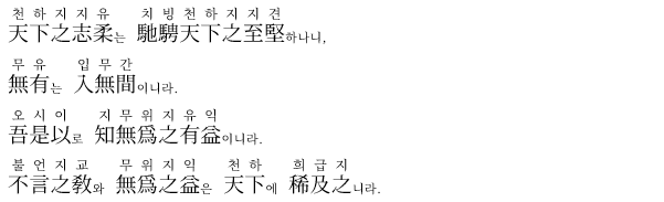 (@) 第43章 無爲之益 가장 약한 것이 가장 단단한 것을 이기는 것이 무위의 유용성이다.