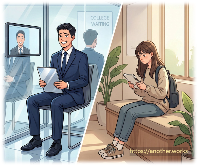 [Scene] 친구(A)가 대학 면접에서 완벽한 답변을 외워 화려하게 말하려 하자, 선배(B)가 노자의 가르침을 빌려 조언합니다.