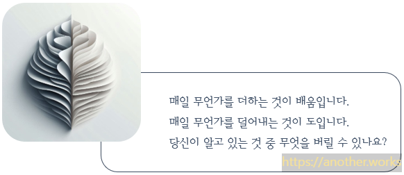 - 배움과 도의 차이: '배움(學)'은 외부 지식과 기술을 더하는(日益) 과정이지만, '도(道)'의 수련은 불필요한 욕심, 관념, 행위를 덜어내는(日損) 과정입니다.
