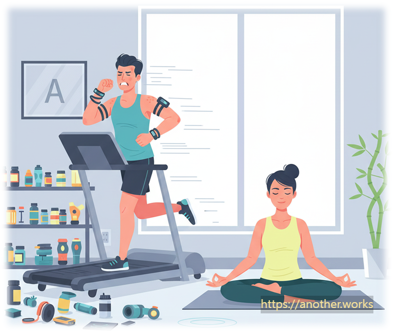 [Scene] 친구(A)가 건강 염려증에 시달리며 과도한 건강 보조 식품과 운동에 집착하자, 균형 잡힌 생활을 하는 친구(B)가 조언합니다.