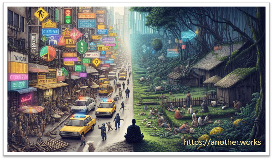 - 규제의 역설: 도덕경은 ''더하면 덜해진다''는 역설을 제시합니다. 정부가 금기, 법령, 무기, 복잡한 기술 등을 늘릴수록, 그에 비례하여 백성은 가난해지고(貧), 나라는 혼란에 빠지며(昏), '범죄가 증가(盜賊多有)'합니다. 이는 모든 인위적인 개입의 한계를 보여줍니다.