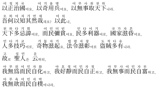'바른 것(정당한 방법)'으로써 나라를 다스리고, '기묘한 것(변칙적인 방법)'으로써 군사를 운용하며, '함이 없음(시키지 않음)'으로써 천하를 얻는다.
