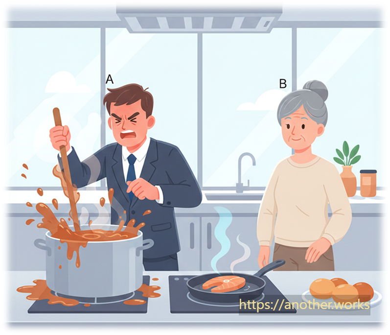 Gotta stay in control! - Colleague B: Ever tried cooking a delicate fish by poking it every second?