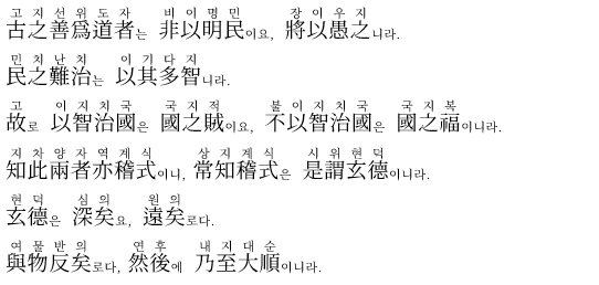 '그러므로 지혜로써 나라를 다스리는 것'은 '나라의 도적'이요, 지혜로써 나라를 다스리지 않는 것은 '나라의 복'이다.