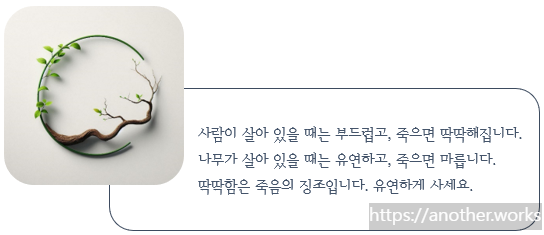 '그러므로 뻣뻣하고 강한 것'은 '죽음의 무리'요, '부드럽고 약한 것'은 '삶의 무리'이다.