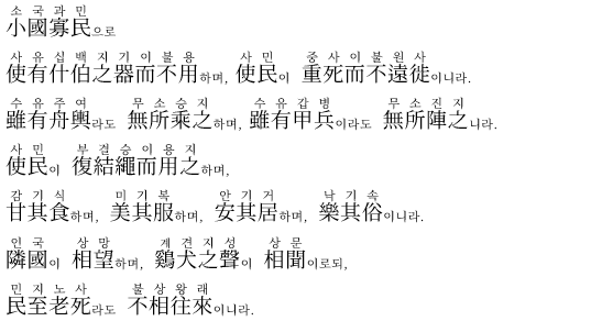 (@) 第80章 小國寡民 소박한 삶에 만족하여 외부에 관심 두지 않는 이상적인 소국을 그린다.